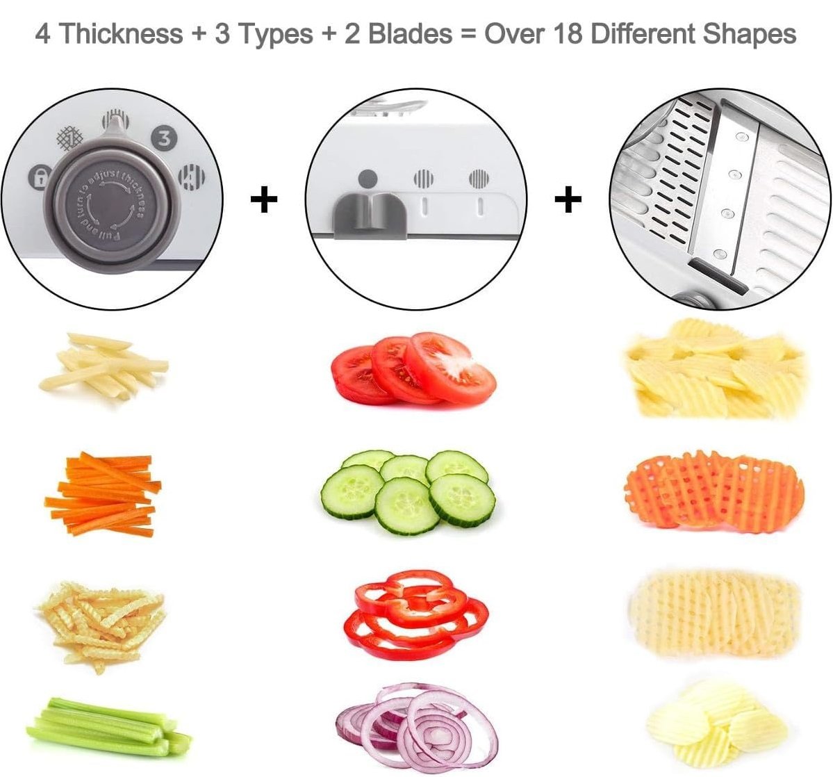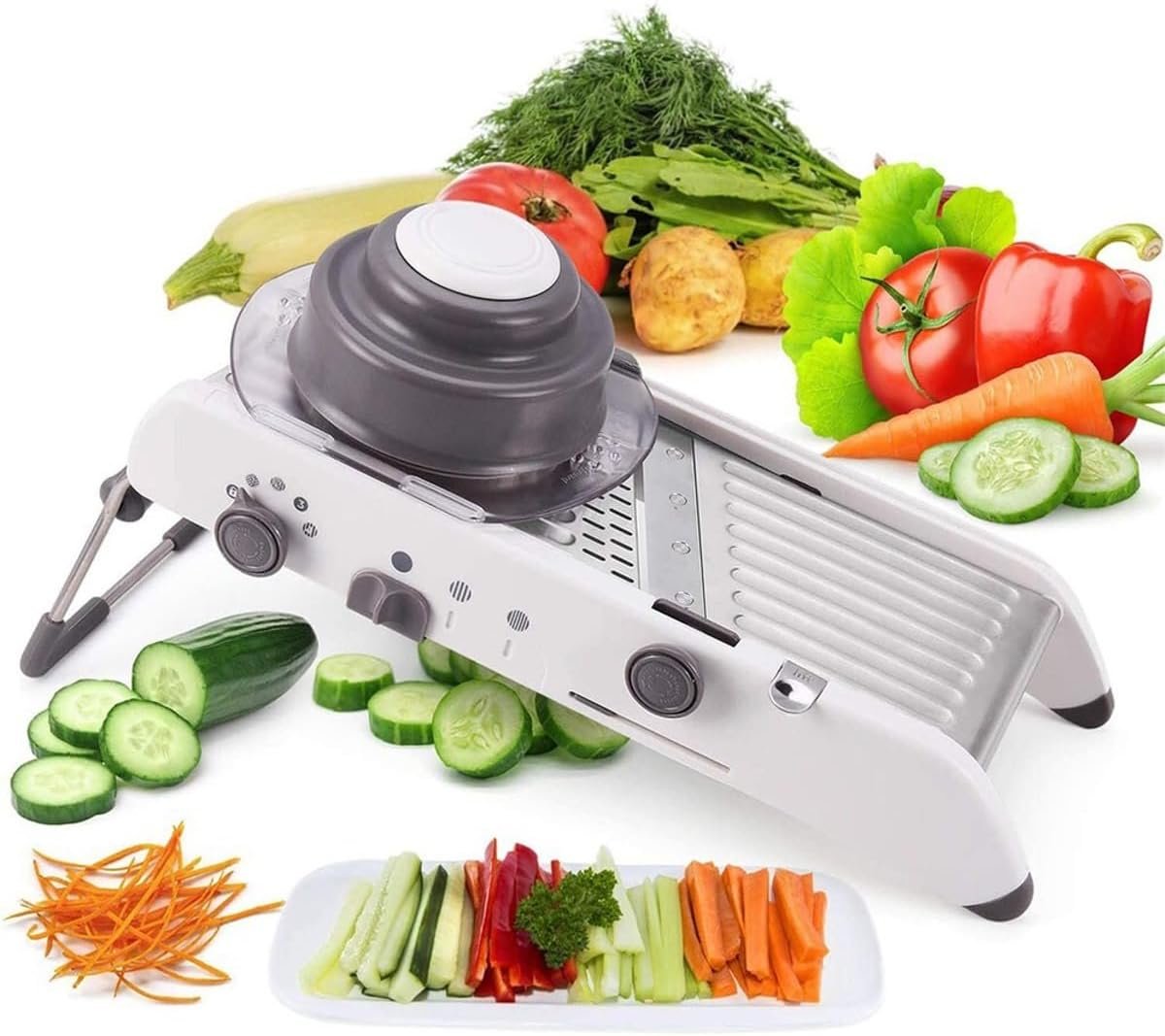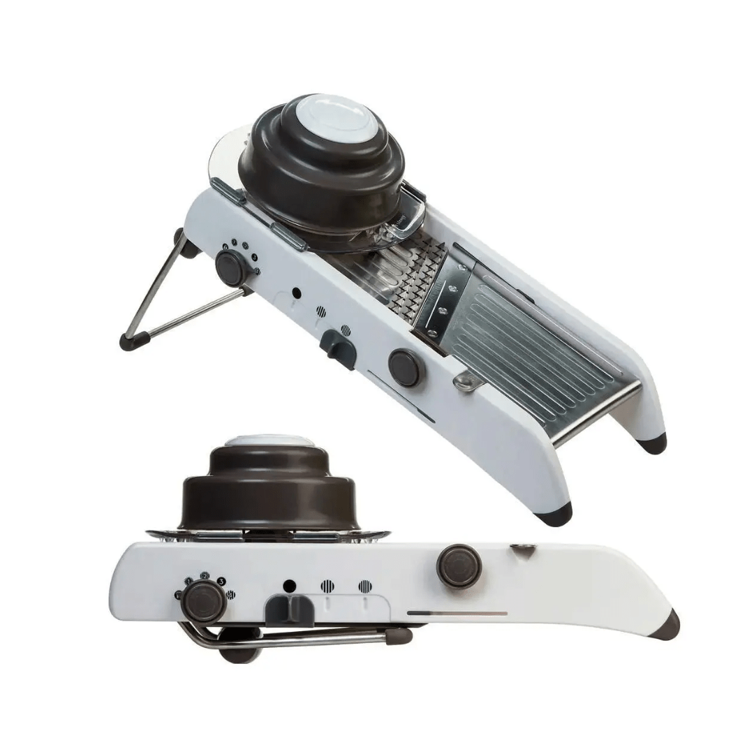 O Fatiador Mandolin Inteligente possui um sistema de corte totalmente integrado, sem peças soltas, proporcionando segurança e facilidade de operação. Com um design simples, é construido com lâminas ajustáveis e não removiveis, que podem ser facilmente alternadas com um simples giro de botão, permitindo uma rápida mudança de corte.