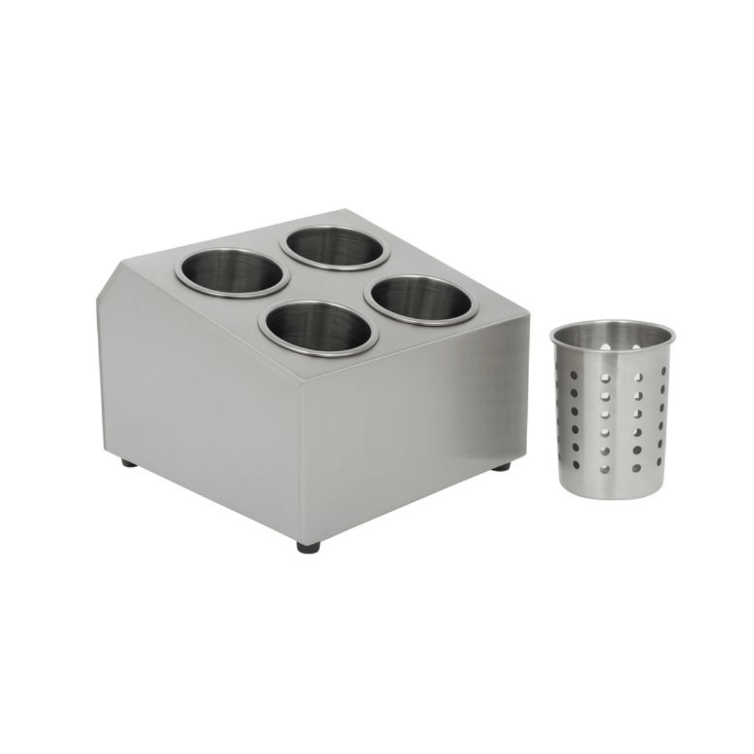 Com estrutura robusta em aço inoxidável, o suporte conta com 4 copos perfurados que facilitam a ventilação e a drenagem da água, mantendo os talheres secos e prontos para uso. Seu design compacto permite posicionamento sobre bancadas ou estações de serviço, otimizando o espaço e agilizando o atendimento.